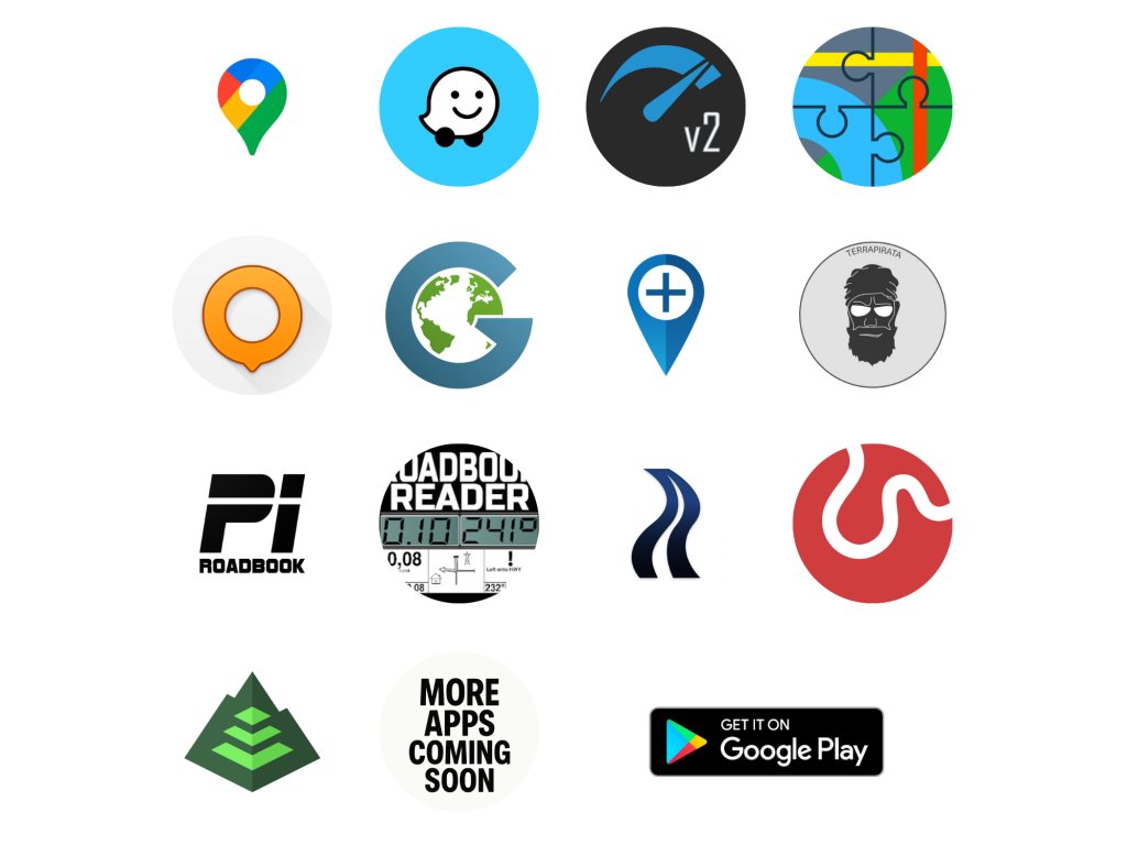 - Kompatibilný s navigačnými, roadbookovými a hudobnými aplikáciami (Google Maps, Waze, DMD2, Locus, OsmAnd, Guru Maps, MyRoute App, Calimoto, Kurviger, Gaia GPS, TerraPirata, Rally Roadbook Reader, Piste Roadbook Reader, Spotify).